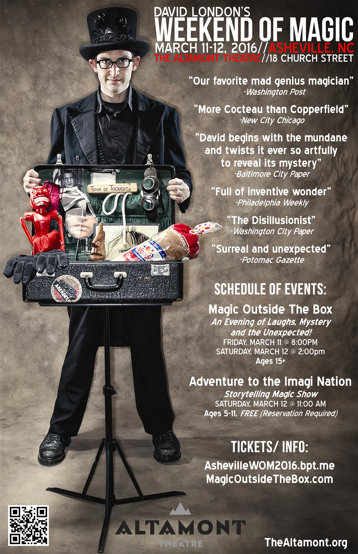 "Magic Outside the Box." It brings together pieces he's created over the past ten years. Magic tricks connect the pieces, but it's also "beyond magic tricks," says London.