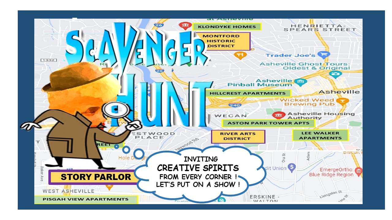 The theatrical readings: The script has half Black characters and half White (with a few roles that can be other). For the Spring 2023 theatrical readings, the plan is to reach out to diverse neighborhoods in a target area of Asheville to recruit a cast and pull a creative team together. Actors will be able to be on book (hold scripts), with blocking, wardrobe, props, and set pieces all obtained in a community scavenger hunt, or created by community members. The goal will be to rotate performance locations, from an art gallery to a church to a public housing community center to a storefront business, to draw-in people who wouldn’t normally turn out together.