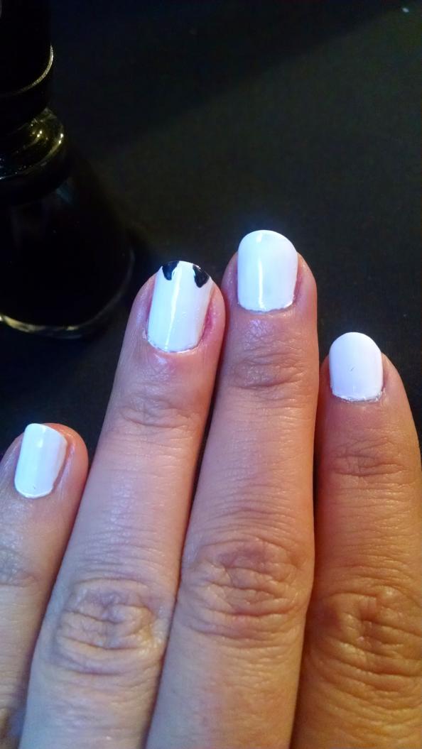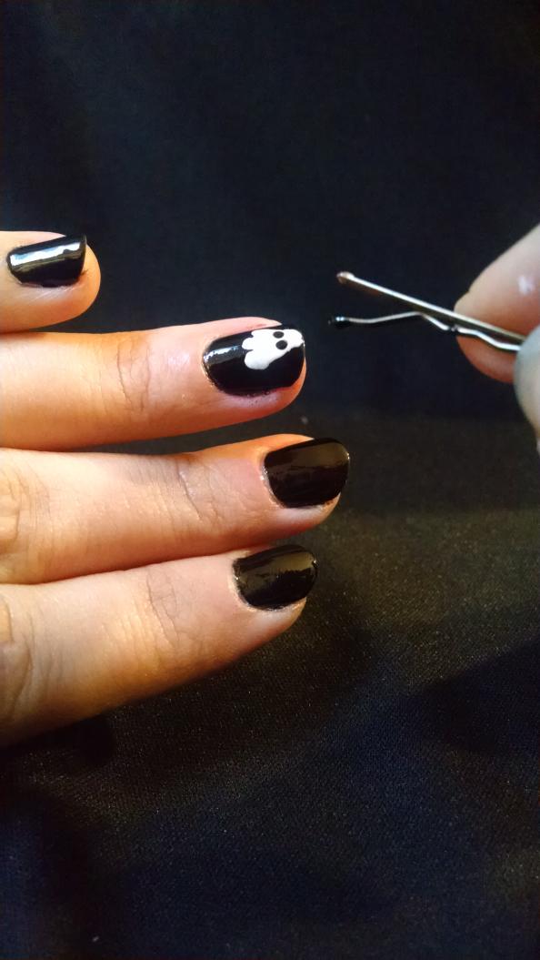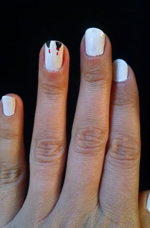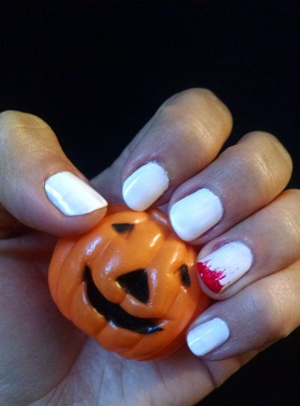 For the ghost design you will just need the black and white polish and the bobbypin. Apply a base coat and let that dry. Then apply two coats of black. After the black is dry, add a small blob of white to your ring finer.  Then take your bobbypin and carefully move the white paint around to create the look of a ghost. I like to put three "bumps" on the bottom to make it seem like it's floating.  Clean off the bobbypin and add two dots of black for eyes. I stopped at one nail but feel free to keep going! Next up is the bloody fangs! You will need white polish, red polish, the bobbypin and the toothpick for this manicure. Start with a basecoat and then two coats of white. After those coats are dry, use the bobbypin to create two upside down triangle at the tip of your nail. It sounds tough but a bobbypin puts a nice dot of polish that can be easily manipulated with a steady hand. Dip the toothpick in a little bit of red polish and carefully place at the tip of the fang and then add some as "drips" down below the fangs. That's it for this one! I think I liked this one the best. And last but not least, the bloody nail. This one reminds me of the classic nail-rips-off-during-the-struggle scene in every horror movie. Plus this one is super easy because it's suppose to look messy! For this manicure you will need a basecoat, white polish, red polish and a bobbypin. After your basecoat and two coats of white polish are dry, apply a strip of red to the tip of your nail. While the red is still wet drag the bobbypin through the red and onto the white. It will look lovely and gory. I think this would be the best manicure if you wanted to do all of your nails.  Ok kids! Have a Happy Halloween!