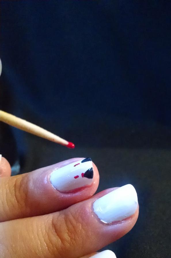 Next up is the bloody fangs! You will need white polish, red polish, the bobbypin and the toothpick for this manicure.